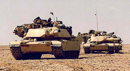 1991年2月24日,多国部队于当地时间4时向伊拉克军队发起地面进攻,代号“沙漠军刀”,目的是消灭科威特战区的伊军特别是共和国卫队,恢复科威特领土主权和合法政府。多国部队在沙科、沙伊边界约500公里正面上由东向西展开5个进攻集团:阿拉伯国家东线联合部队沿海岸向北进攻,占领科威特市;美第1陆战远征部队从沙科边界“肘部”向北进攻,将伊军主力吸引到科威特;阿拉伯国家北线联合部队从沙科边界西段进攻,协同友邻部队消灭科威特境内伊军并占领科威特市;美第7军实施主要突击,从巴廷干河以西向北推进,直插伊拉克纵深,尔后挥师东进,与第18空降军协同作战,将伊拉克共和国卫队(约8个师)围歼在巴士拉以南地区;美第18空降军实施辅助突击,从沙伊边界突入伊境至幼发拉底河岸,协同美第7军歼灭伊军共和国卫队。