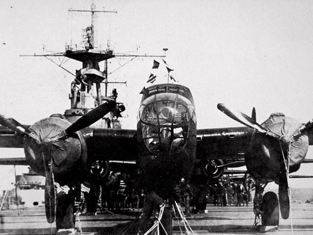 1942年4月13日,搭载16架“B-25”轰炸机的“大黄蜂”号航母编队,在预定海域与担负支援任务的以“企业”号航母为核心的第16特混编队会合。编队司令官哈尔西中将正式宣布,该舰队的任务是轰炸日本首都东京。