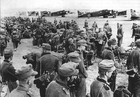 1941年5月20日,德国军队开始对克里特岛实施大规模空降作战。德国空降作战部队的主力为第11航空军指挥下的第7空降师、第5山地师和滑翔突击团,担任运载部队的有500余架Ju-52运输机和80架滑翔机。当日凌晨二时,德国空降兵开始在克里特岛多处地点空降,分成三个集团集中攻击岛上三个机场和干尼亚。德军落地后遭到守岛英军和希腊部队的顽强抵抗,损失极其惨重。德军经过惨烈战斗后占领了马拉马机场,并迅速将第五山地师机降在该处,从而控制了战局。随后盟军开始后撤,德军于6月2日占领了全岛。战役中盟军损失2.8万人,海军也遭到了很大损失,而德军阵亡、失踪包括第7空降师师长萨斯曼少将以下约4000人,总伤亡达到1.4万人,损失飞机220架,其中运输机179架。克里特岛因此被称为“德国伞兵的坟墓”,此战成为德国最后一次大规模空降作战。