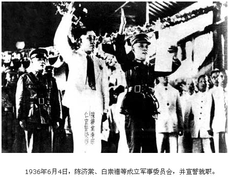 1936年6月1日,两广事变爆发。当日,广东陈济棠和广西李宗仁、白崇禧,公开反蒋,发表“北上抗日”通电。6月4日,陈济棠、李宗仁领衔成立军事委员会和“抗日救国军”,并表示誓率所部“力国家雪频年屈辱之耻,为民族争一线生存之机”。