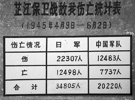 1945年6月7日,进攻湖南芷江的日军全线败退至出发地,中日湘西会战(雪峰山会战)宣告结束。中国方面统计杀伤日军36358人,俘虏204人。日军第20军统计自身战死1017人,病死2181人,战伤1181人,生病:4月份5336人,5月份4657人,6月份14647人。