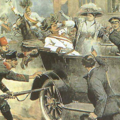 1914年6月28日,奥匈帝国皇太子弗兰茨·斐迪南大公及其妻子在萨拉热窝视察军事演习时,被塞尔维亚爱国青年加费格里·普林西斯刺死。受德国支持的奥匈帝国籍此挑起战争,于7月28日向塞尔维亚宣战,企图吞并塞尔维亚。随后支持塞尔维亚的俄国开始总动员,随后德国、法国、英国等国先后开始战争准备并互相宣战。“萨拉热窝事件”成为第一次世界大战的导火索。