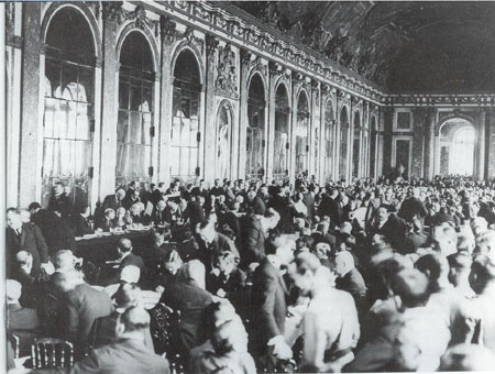 1919年6月28日,凡尔赛和约(对德和约)签字。德国外长贝尔代表战败国一方在“协约及参战各国对德和约”上签字,代表战胜国签字的一方是美、英、法、意、日等26国。因签字仪式在凡尔赛宫举行 ,故通称《凡尔赛和约》。和约的条款十分苛刻,凡尔赛条约不仅使德国海外殖民地丧失殆尽,而且对欧洲的德国疆界也做了很大变动。德国丧失了原有国土的 1/8,全部人口的1/10。条约禁止德国实行普通义务兵役制,限定陆军不能超过10万人,不能拥有空军,不能使用坦克和重炮,海军只能拥有36艘军舰,禁止使用潜艇。至于莱茵河以西的北部、中部和南部地区,分别由国联占领5年、10年和15年。确定德国的赔款总额为1320亿金马克。