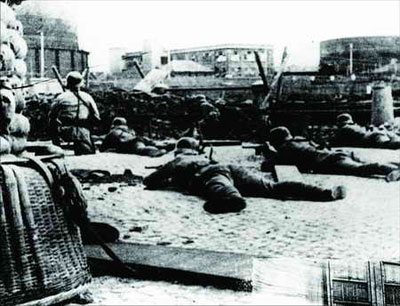 1937年10月27日,自26日日军突破大场后,中国守军被迫放弃第二道防线后撤,上海市区大部沦陷。中国第88师524团中校副团长谢晋元、营长杨瑞符率第一营士兵400余人(人称“八百壮士”)退守闸北光复路四行仓库,孤军奋战坚持与日军血战至四日,击毙日军200余人。至30日奉命撤退至租界。